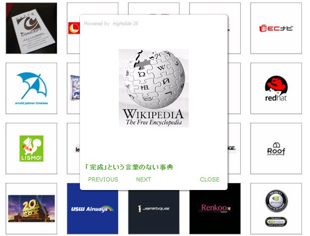 ロゴの一覧画面のサムネールクリックで表示されるウインドウ内の、下から2行目(上の場合 “ 「完成」という言葉のない事典 ” )がそのロゴのエントリーへのリンクです。